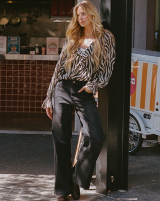 A printed, flowy blouse is the perfect pairing with denim, layered over lace intimates for a Spell twist on urban dressing.